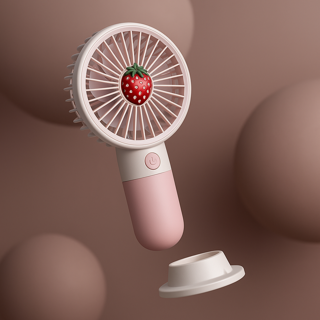 Featuring a charming pink body with an adorable strawberry decoration on the fan blades, this fan adds a playful touch to your summer essentials. The fan comes with a USB charging cable, making it easy to recharge on the go — just plug it into your laptop, power bank, or USB adapter.